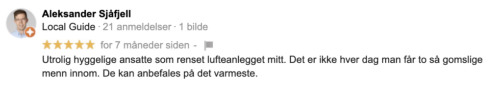 Oppfølgingen vi fikk underveis og i etterkant gjør at vi er helt trygge på at rens av ventilasjonskanaler hos oss ble utført på skikkelig vis – fra kjeller til tak.